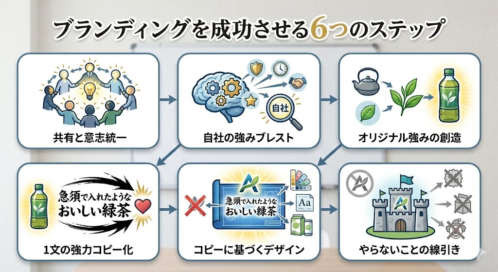 ブランディングは費用をかければ成功するというものではありません。以下の6つのステップを踏むことで、成功確率を高めることができます。