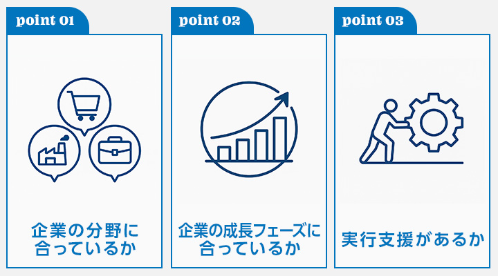そのため、適切なコンサル会社を選ぶには、以下の3つのポイントを意識することが重要です。