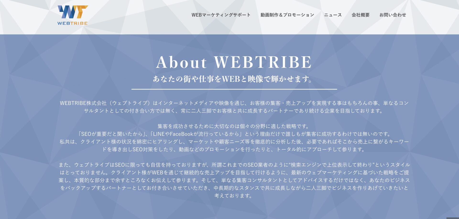 WEBTRIBE株式会社は、札幌市を拠点とするWebソリューション企業です。「Webの力でビジネスを変革する」をミッションに掲げ、Web広告とSNS運用に強みを持っています。