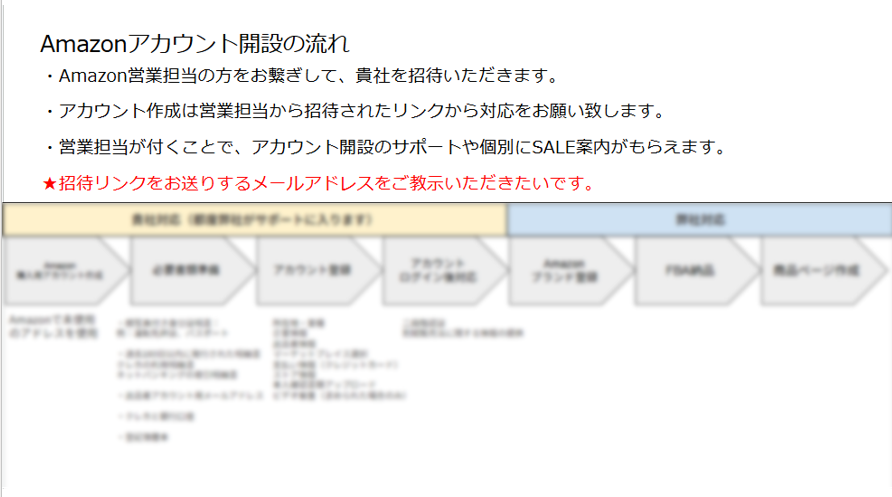 ・Amazonの開設に必要な流れを開設し、Amazon開設までのサポートを致します。